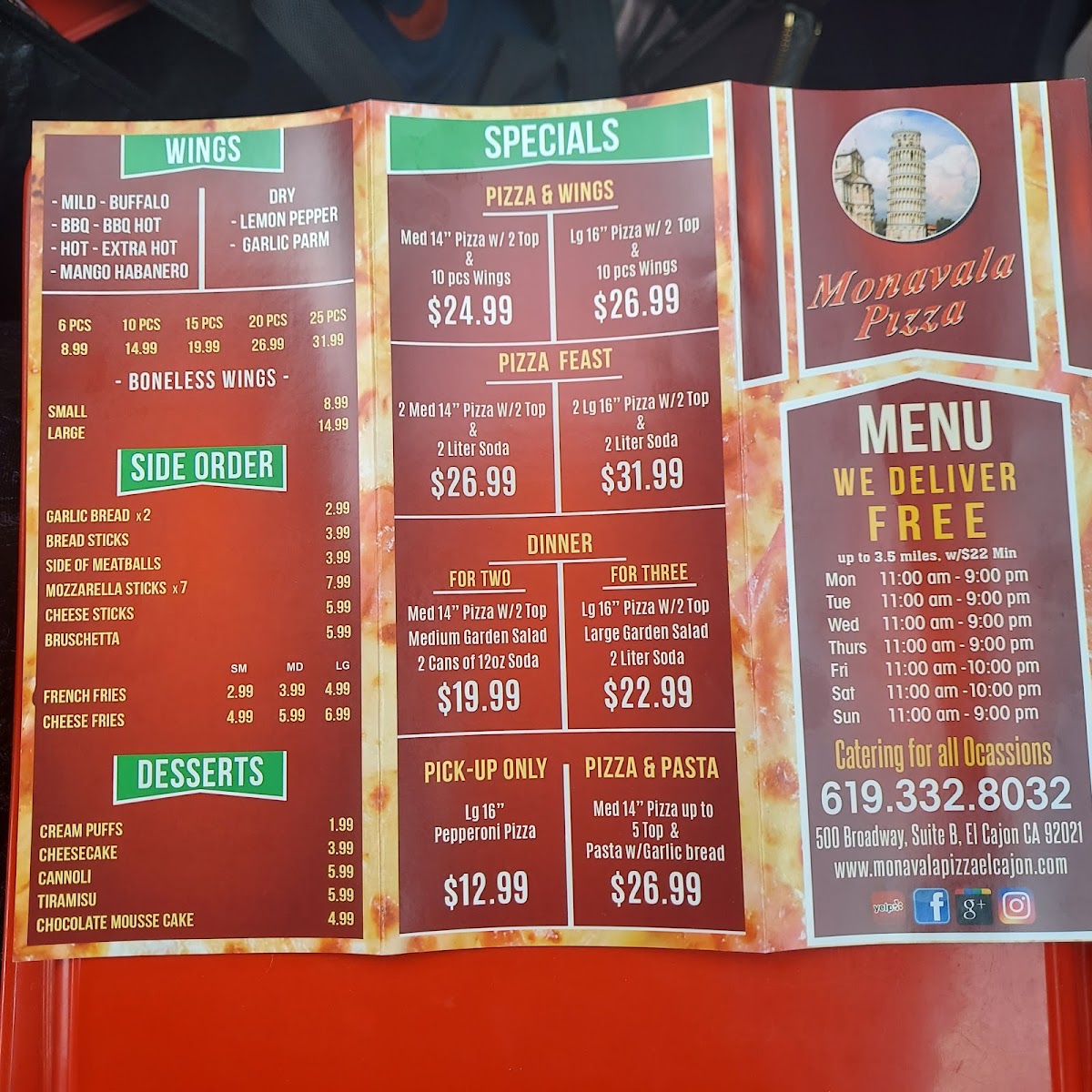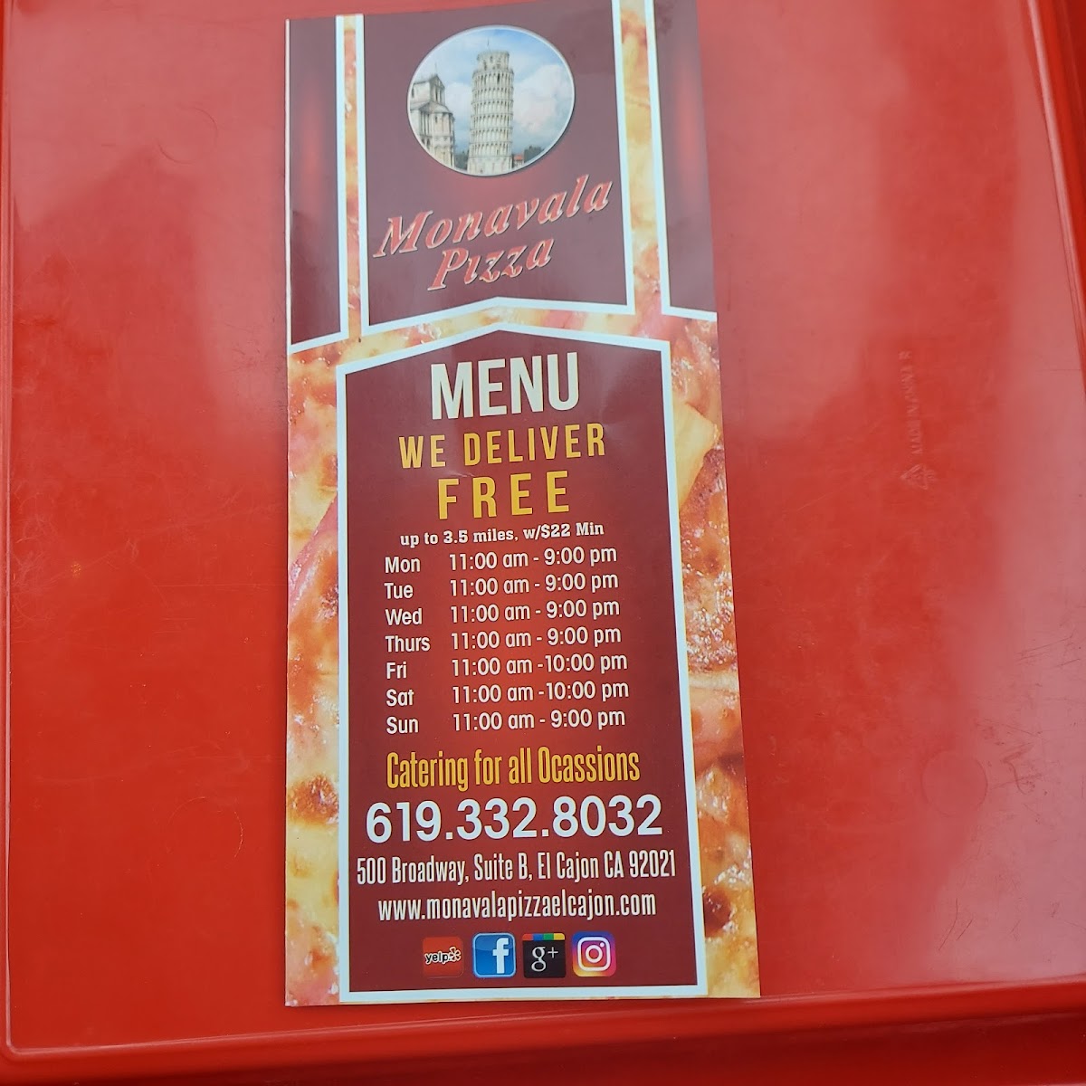 Welcome to Monavala Pizza, a culinary gem nestled in El Cajon, CA, offering a vibrant menu that caters to all pizza lovers. The star of the show is their Classic Cheese Pizza, made fresh with high-quality ingredients or customize it to your liking. For those seeking a gluten-free option, the Gluten Free Cheese Pizza is a delightful choice.